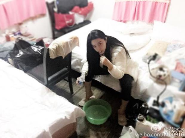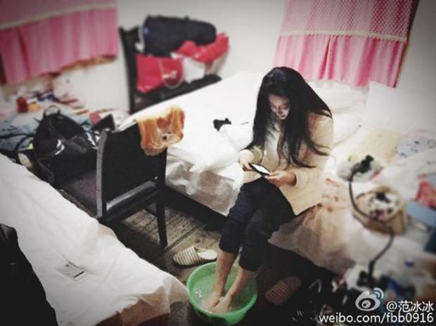 4月4日,范冰冰更新微博晒刷牙泡脚的照片。范冰冰披坐在床沿,将脚放在塑料盆泡着,另外一张,裤脚高高挽起,穿着拖鞋坐在床边刷牙,看上去十分的接地气。