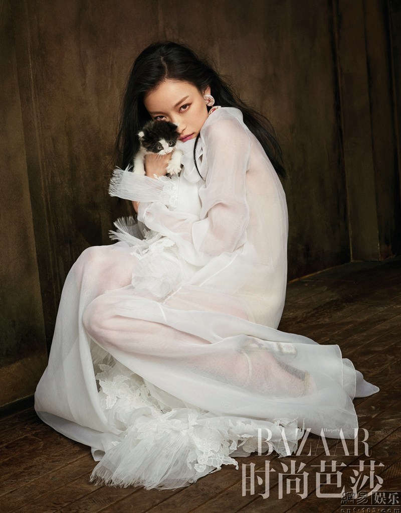 网易娱乐4月26日报道(图文/小易) 穿着时髦的虎头连衣裙,肩上却趴着一只倦意十足的小猫咪,这幅颇为有趣的画面正是倪妮为《时尚芭莎》拍摄的最新“油画”封面,眼神中带着慵懒气质的“喵总”倪妮与画面背景的复古风格十分融洽。