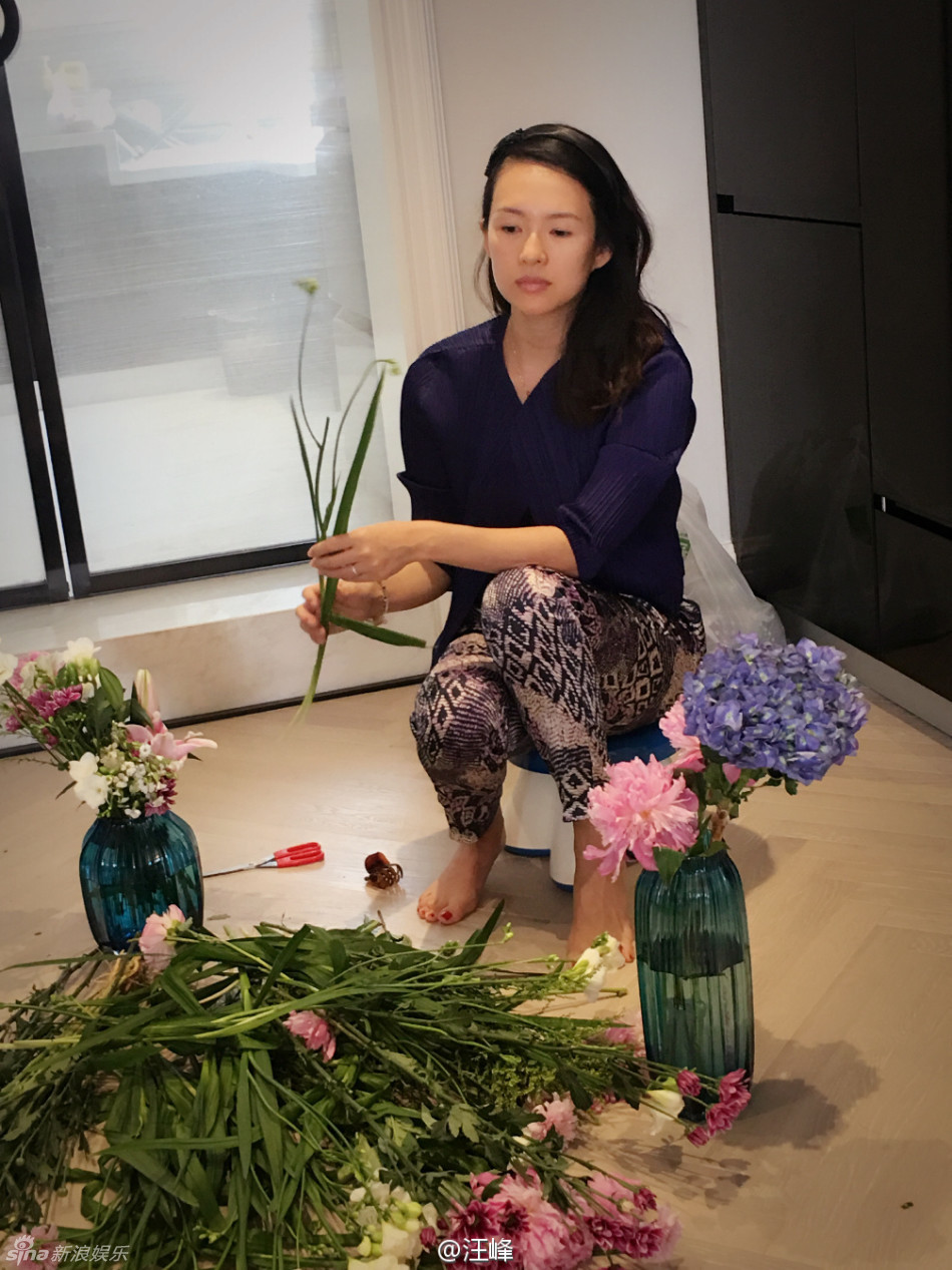 章子怡素颜赤脚插花 汪峰盗图大赞醒醒妈贤惠