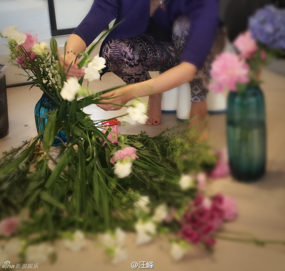 章子怡素颜赤脚插花 汪峰盗图大赞醒醒妈贤惠