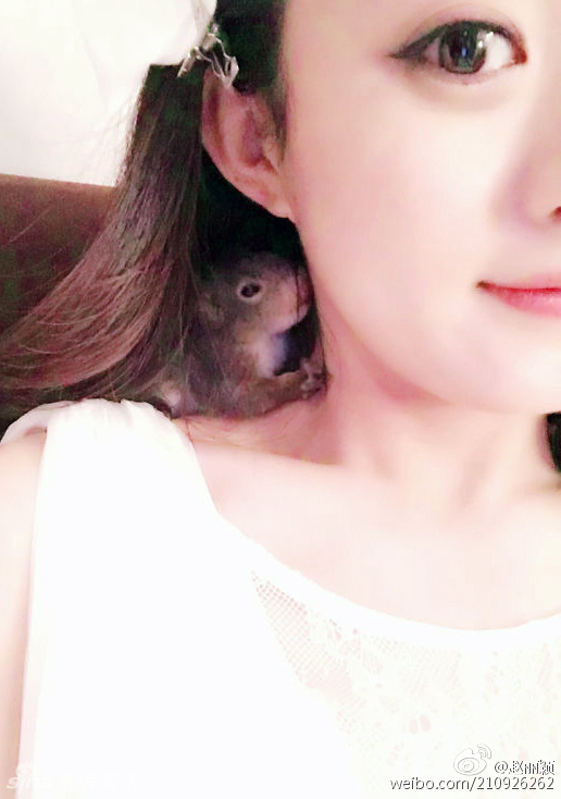 赵丽颖将小松鼠放在脖颈处 不时抚摸、献吻(图)