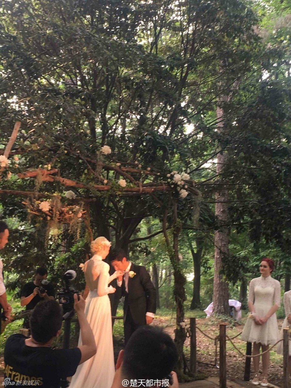 新浪娱乐讯 5月6日,撒贝宁、李白在武汉东湖梅园举行婚礼。撒贝宁一身帅气西装现身,新娘子李白穿婚纱身姿婀娜,两人深情拥吻,李白大露美背。
