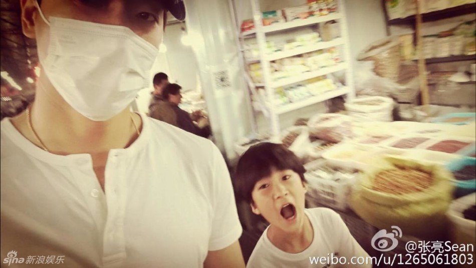 5月6日,张亮晒出一组和儿子逛菜市场的温馨照。张天天顶着西瓜头,又长高了不少,自嗨停不下来,老爸张亮戴着口罩开心和儿子自拍。