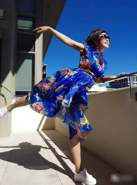 照片中,刘晓庆穿蓝底红花的连衣裙,脚上穿着运动鞋,戴着墨镜,把脚高高翘起,作出一副展翅高飞的样子,笑容十分灿烂。