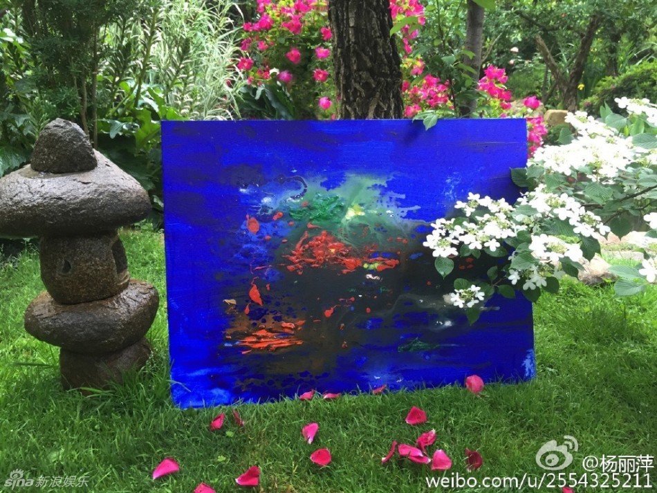 5月13日,杨丽萍晒出一组花园画画的照片,鲜花满布好似仙境,杨丽萍民族风打扮,鸟儿落在她的肩上、手上、画中,丝毫不惧怕。