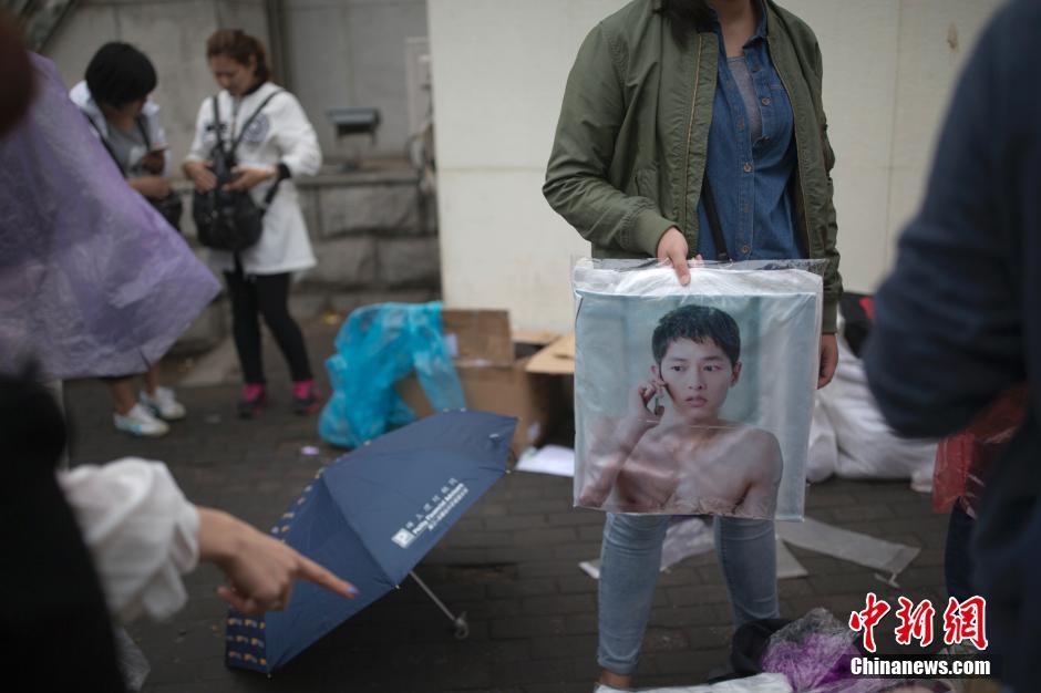 5月14日,北京站“2016宋仲基亚洲巡回粉丝见面会”在国家奥林匹克中心体育馆举行,韩国艺人宋仲基在见面会上与粉丝进行互动,引发粉丝阵阵尖叫。宋仲基还将奔赴武汉、广州、深圳、上海、香港、成都、台北,完成此次大中华区八座城市的粉丝见面会。图为印有宋仲基图像的产品在体育馆附近热销。中新社记者 刘关关 摄