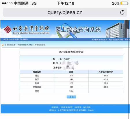 高考成绩出炉:关晓彤总分552分 张雪迎总分415分