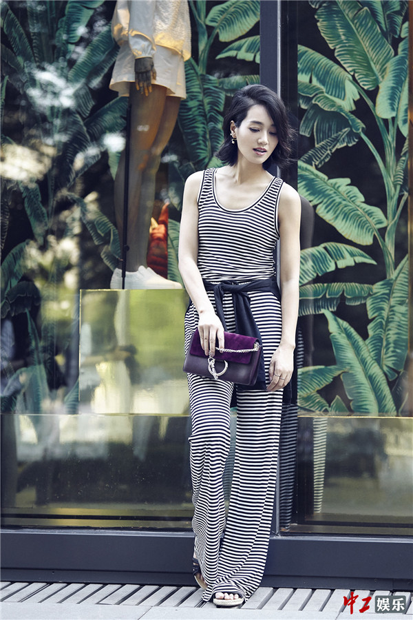 朱丹身着黑白条纹连身裤 演绎夏季最时尚街拍