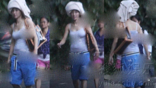 一向穿衣服都有独特个人品味的张柏芝,身上只穿着件薄如蝉翼的背心,但下身就离奇配条十足男装沙滩裤,再加对白鞋,身型全无,背心之下竟然离奇凸肚子。