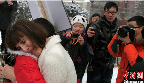 疯狂英语创始人李阳离婚案在北京宣判,法院认定李阳家庭暴力行为成立,并判决。图为李金哭着与支持者相拥。中新社发 韩海丹 摄