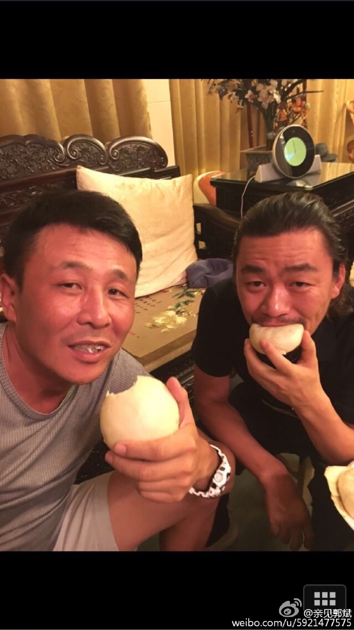 新浪娱乐讯 8月28日晚,兵乓球世界冠军王楠的老公郭斌在微博上晒出一组与王宝强把酒言欢的照片,二人喝酒吃馍馍,王宝强也终于露出久违的笑容。