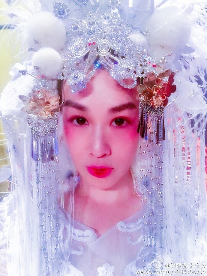 新浪娱乐讯 钟丽缇与鲜肉丈夫张伦硕晒出京剧婚纱照,妆感别出心裁,她穿白纱,咬唇自拍眼神妩媚。