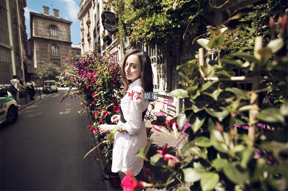 写真中,张嘉倪笑容甜美,披肩长发搭配俏皮的耳饰,身穿带有黑色抹胸设计的白色长款衬衫,置身浪漫的田园花架中,完美诠释初夏轻妙之感。
