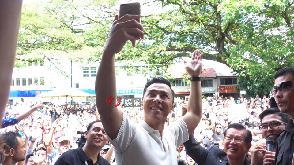 甄子丹也和大家热情互动,主动提议和粉丝们集体自拍大合照,令粉丝尖叫不已。除此之外,甄子丹还走向人群并抛出纪念礼物,礼物每一次落下也都引起一阵欢呼,送完礼物又再次拍摄大合照,与粉丝如此亲密互动,无怪乎现场气氛会火热过气温。而甄子丹似乎仍不满足,上车驶离会场时还从车中站起,透过天窗和在场民众握手。