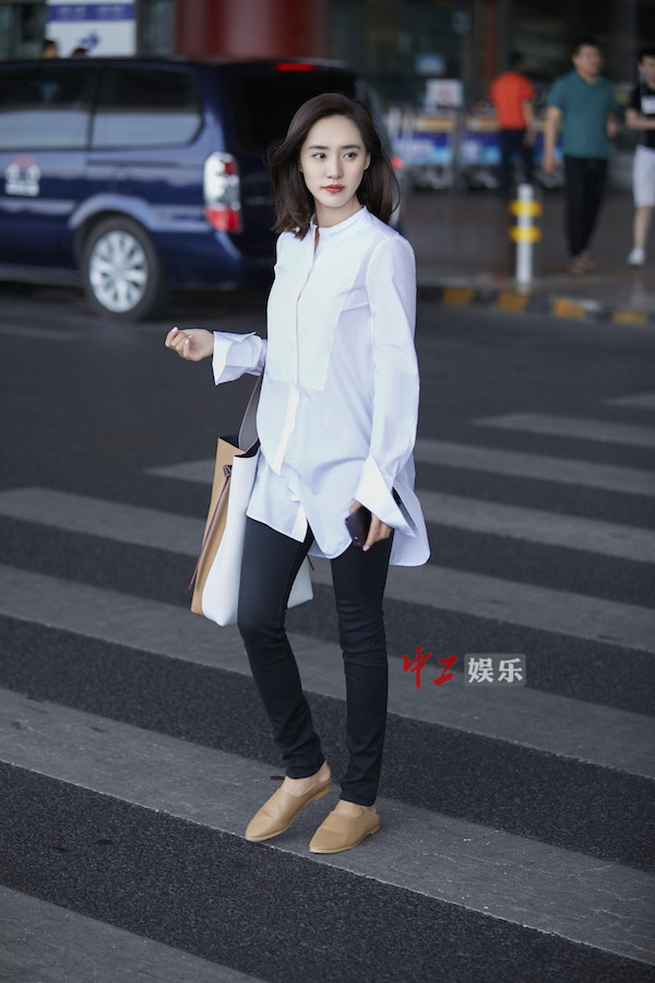 王智白衬衫黑仔裤机场Look 简约舒适大方显品味