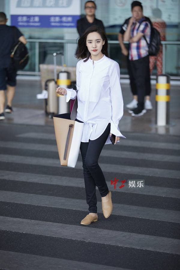王智白衬衫黑仔裤机场Look 简约舒适大方显品味