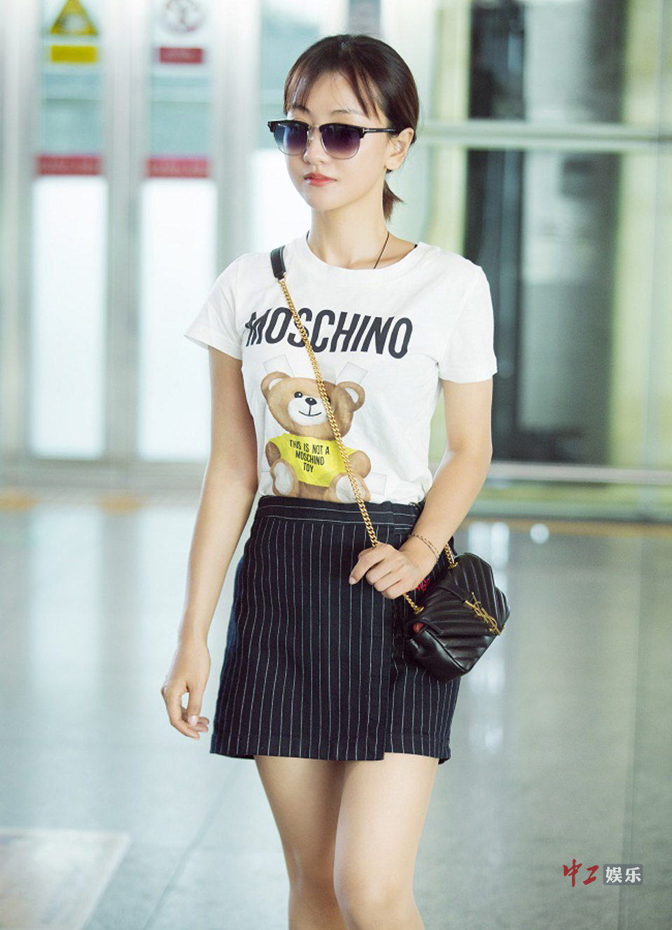 中工娱乐2017年8月8日报道 近日,杨蓉现身北京机场,白色卡通T恤搭配深蓝色条纹短裤,舒适清爽。短发随意扎起,墨镜遮面,整体look简单又不失时尚。