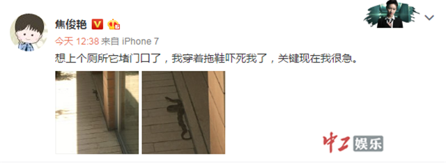 中工娱乐2017年8月9日报道 昨日,焦俊艳通过微博晒出两张图,并配文:“想上个厕所它堵门口了,我穿着拖鞋吓死我了,关键现在我很急。” 图中,洗手间门口蜷缩着一条状似蛇形的物体,另一张图则为蛇形物体的放大版。