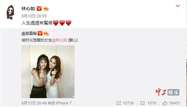 中工娱乐2017年8月14日报道 8月12日晚上,张嘉倪微博分享一张与林心如合影,并艾特林心如称:“被时光宠爱的女生”。照片中,张嘉倪身穿浅色上衣搭配黑色镂空裙,秀发披肩,耳饰实力抢镜。林心如一袭白裙,搂着张嘉倪肩膀,两位琼女郎紫薇、紫菱笑容灿烂,一同比心,同框超吸睛。