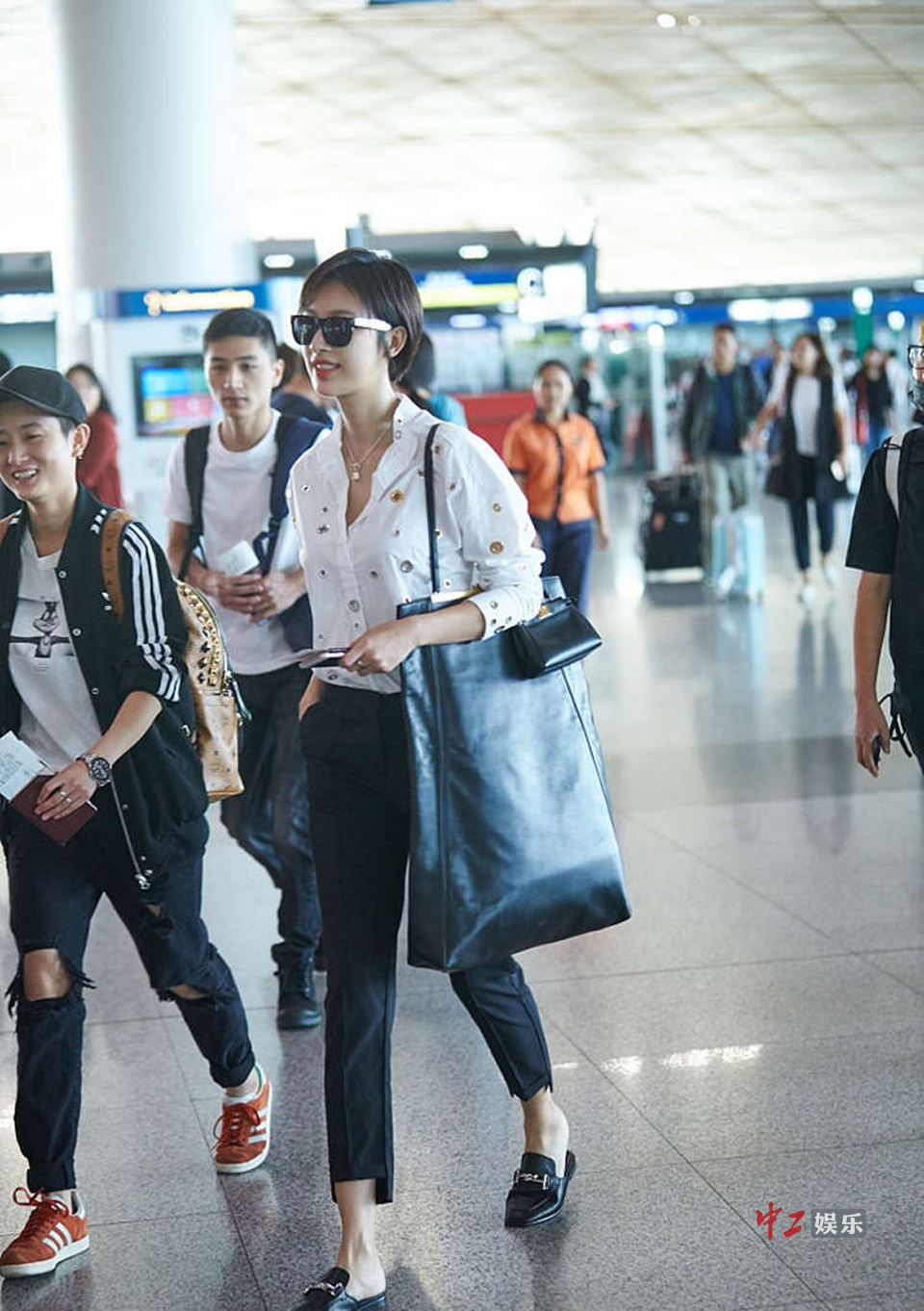 张俪现身机场,上身白色镂空衬衫,下身黑色九分裤搭配乐福鞋,简单休闲,随性十足,一个超大型号的包包尽显个人风格,造型满分。