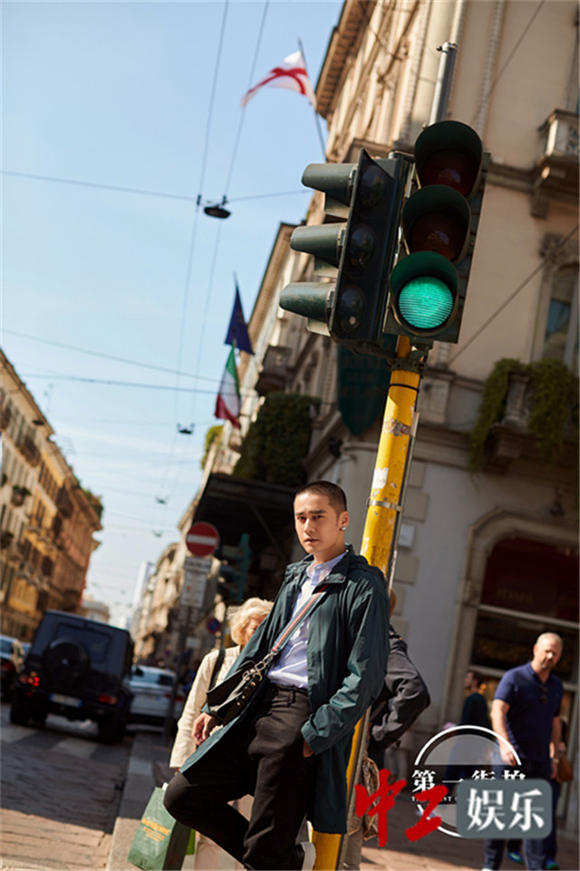 这组街拍拍摄于米兰时装周期间,蒋劲夫身着深绿色风衣搭配衬衫与运动鞋,混搭使得通勤和运动两种风格兼具。照片背景里都是行色匆匆的欧洲面孔,而夫仔倚靠在人行道边的红绿灯柱上,在清晨的阳光照耀下眉头微皱着直视镜头,整个画面极具故事感。