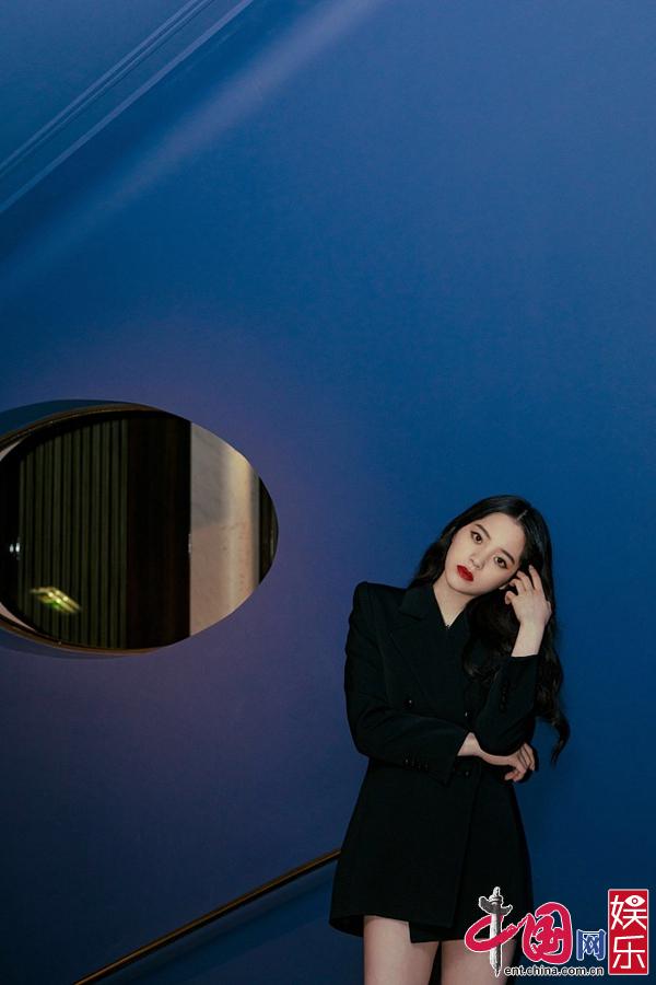 欧阳娜娜身穿黑色西装玩下衣失踪,美腿纤细修长,涂红唇化身酷女孩又美又飒。