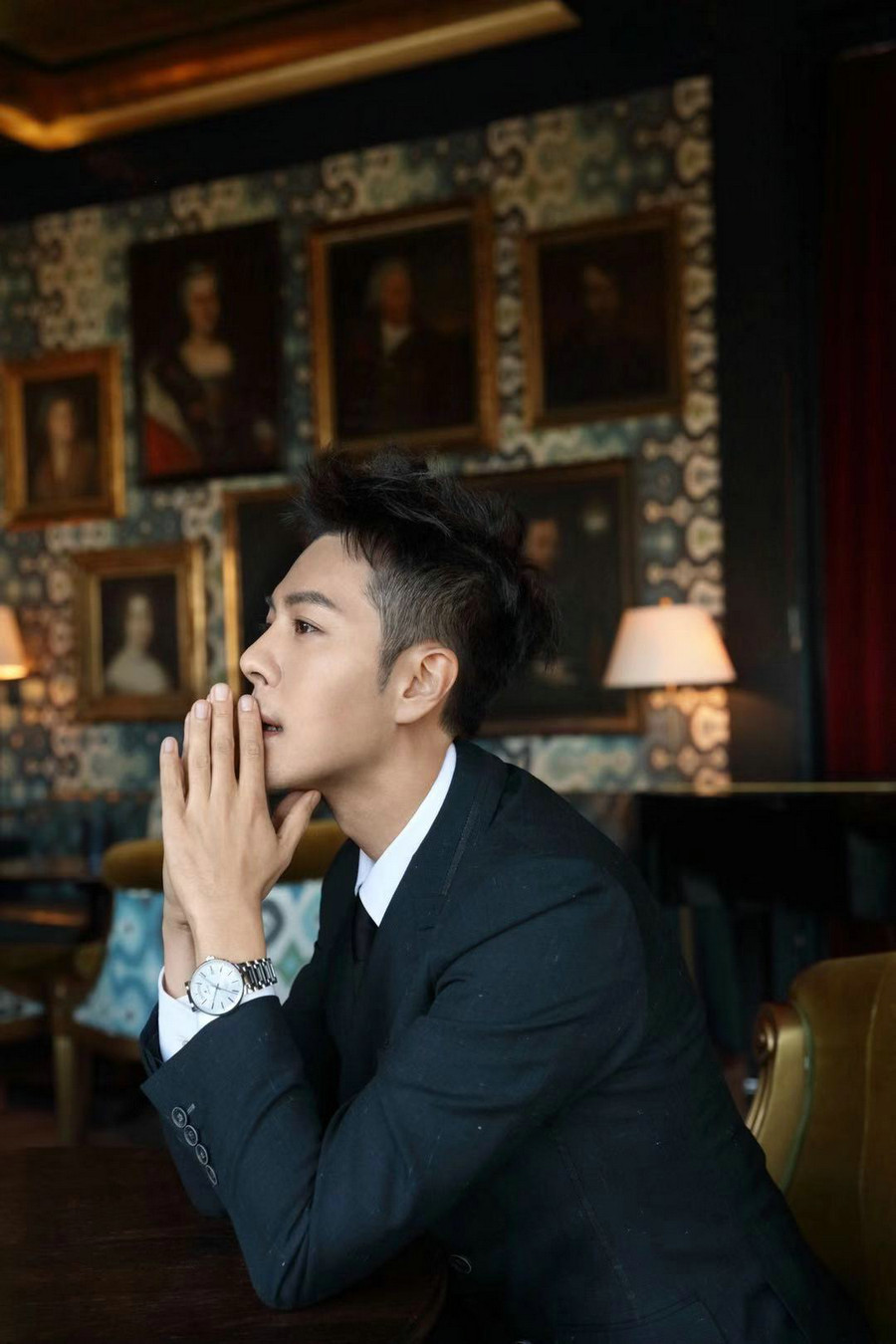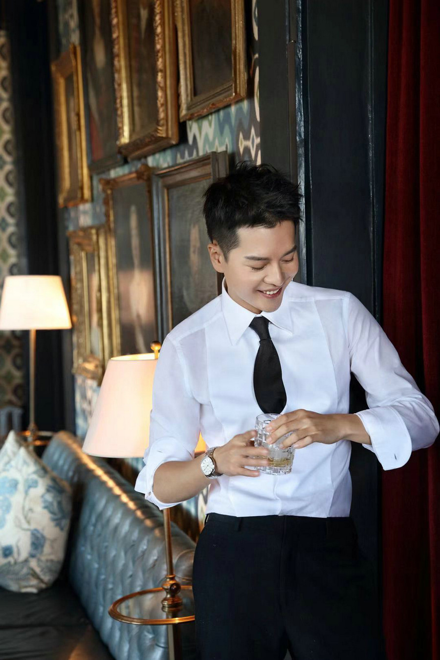 图片中,徐海乔身穿黑色西装搭配白色衬衣,黑色领带点缀,加上他利落有型的短发,展现出了他独特的魅力和气质。面对镜头时,他的眼神和动作都十分有魅力,展现了不凡的绅士风范。