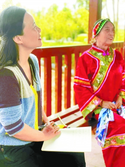 龚琳娜(左)在云南省弥渡县倾听传承人唱民歌。