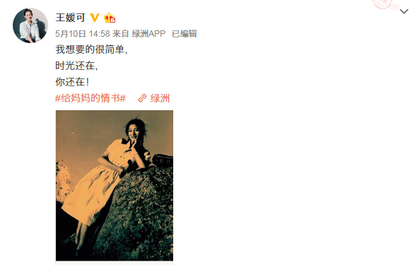5月10日母亲节,实力女演员王媛可在社交平台上晒出妈妈的照片,并配文:“我想要的很简单,时光还在,你还在!”