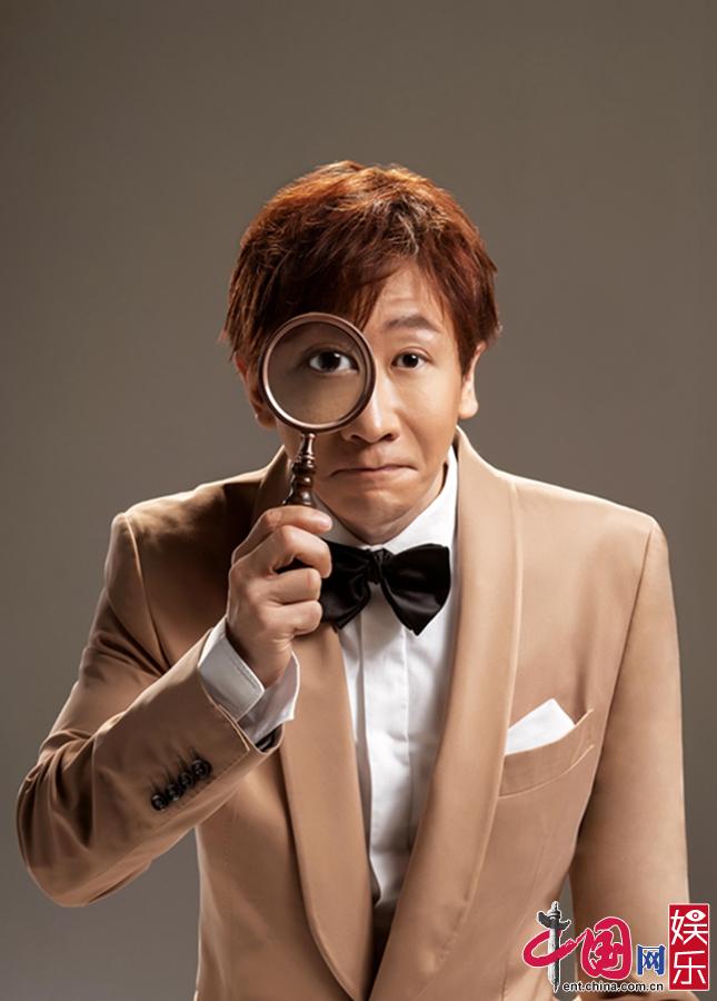 另一组照片中,他身穿米黄色西装搭配白衬衫和蝴蝶领结,简洁大方,彰显男士风范,手持的放大镜给魔术师增添一丝俏皮气质。