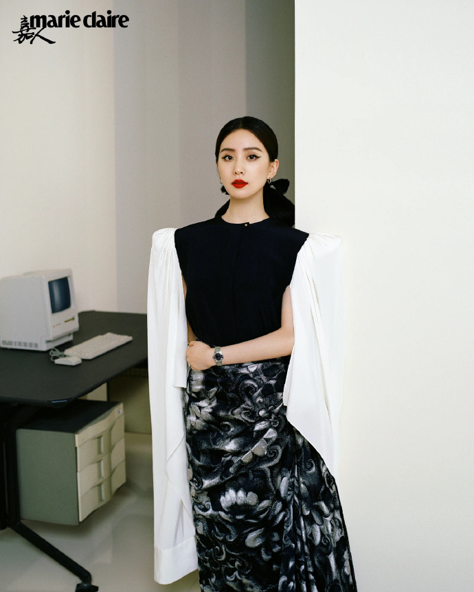 在这组封面大片中,刘诗诗尽情地表达了自己的态度。墨色光影下,她头戴宽檐帽,搭上丰茂的羽毛配饰,夸张蓬松的上衣设计和圆拢的阔腿裤,或坐或站或闭目倚墙,都呈现出一种静谧中的凌厉。而换装黑色长裙,胸前蜿蜒而上的线条和盘起的秀发,还有微张的红唇,则流露出女性隐藏的神秘美感。