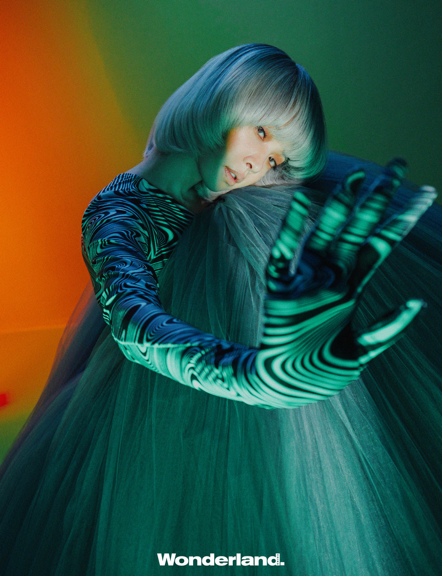 蔡依林身着蓝色丝质连体裤,以“蜥蜴指甲”装饰双手,伏身于剑鱼一侧,在光怪陆离的动物世界里泰然自若。而另一套斑马纹紧身上衣搭配丝质长裙,银色短发在奇妙光影下呈现出渐变色视觉效果,让蔡依林融入整个绚丽迷幻的多彩空间。立体感抹胸连体衣,不规则拼接的长裙,夸张的蝴蝶结配饰,营造出赛博朋克的氛围。