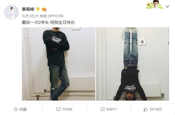 李易峰发倒立照 庆祝最后一个2字头的生日