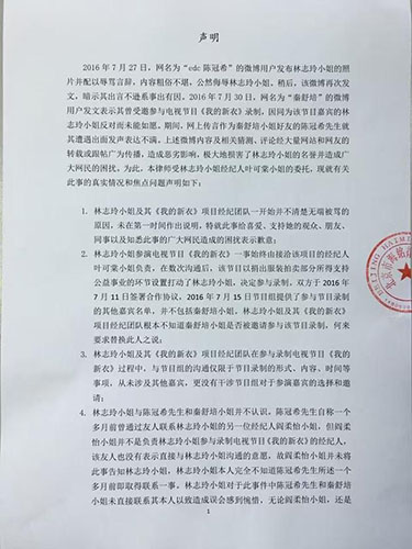 之前一直保持和气的态度,林志玲方面8月2日发布声明,就此次事件进行说明:接洽《我的新衣》的过程中,林志玲根本不知秦舒培是否受邀,并没有要求换人之说;林志玲和节目组的沟通仅限于节目的内容和形式,未涉及其他嘉宾;林志玲和陈冠希、秦舒培并不认识,陈冠希通过友人和林志玲的工作人员沟通,经纪人并未告知林志玲;微博名为“绅士风度香”的微博用户擅用林志玲的名义造成双方的误会,林志玲不知情;针对陈冠希这一系列的辱骂行为已经造成了林志玲的名誉损害、精神损害和经济损失,希望其承当相应的法律责任,林志玲保留依法追究的权利。 (红网 朱青 实习生 曹雅雯 吴雪阳))