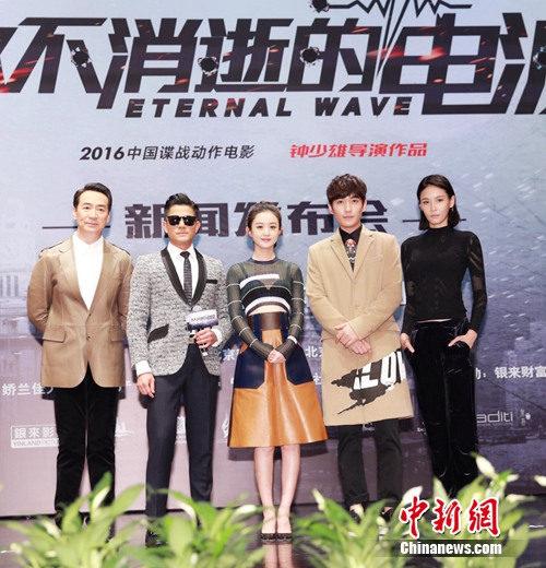 中新网12月10日电 2016年最值得期待的谍战动作电影《新永不消逝的电波》近日在上海举行开机发布会,导演钟少雄携主演郭富城、赵丽颖、张蓝心、朱一龙、寇振海等亮相。张蓝心一袭黑色运动装、平底鞋亮相引来阵阵尖叫,其“打女”形象更显帅气。