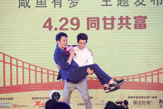网易娱乐2月28日报道(文/乔克德 摄影/道哥)2月28日下午,电影《梦想合伙人》在京举行“咸鱼有梦”主题发布会。导演张太维携主演姚晨、郝蕾、李晨、UNIQ组合王一博、金圣柱等亮相,现场分享曾经的青春梦想和戏中角色特征。因《我是歌手4》一唱成名的“当红炸子鸡”黄致列也作为电影主题曲演唱者来到现场鼎力助阵,还在台上与李晨上演连环公主抱,两位肌肉男的亲密互动羡煞粉丝,引爆全场。