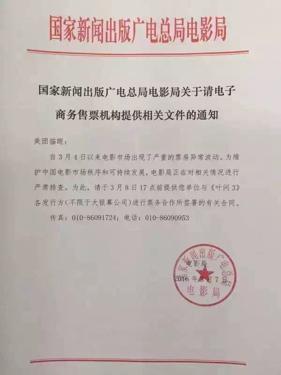 尽管电影局方面并未做出正面回应,但从已经约谈片方相关负责人以及下达的将对相关问题进行严肃排查,并已要求各票务网站提交有关《叶问3》票务合作的合同协助调查的文件来看,电影局对此事态无疑是非常关注的。