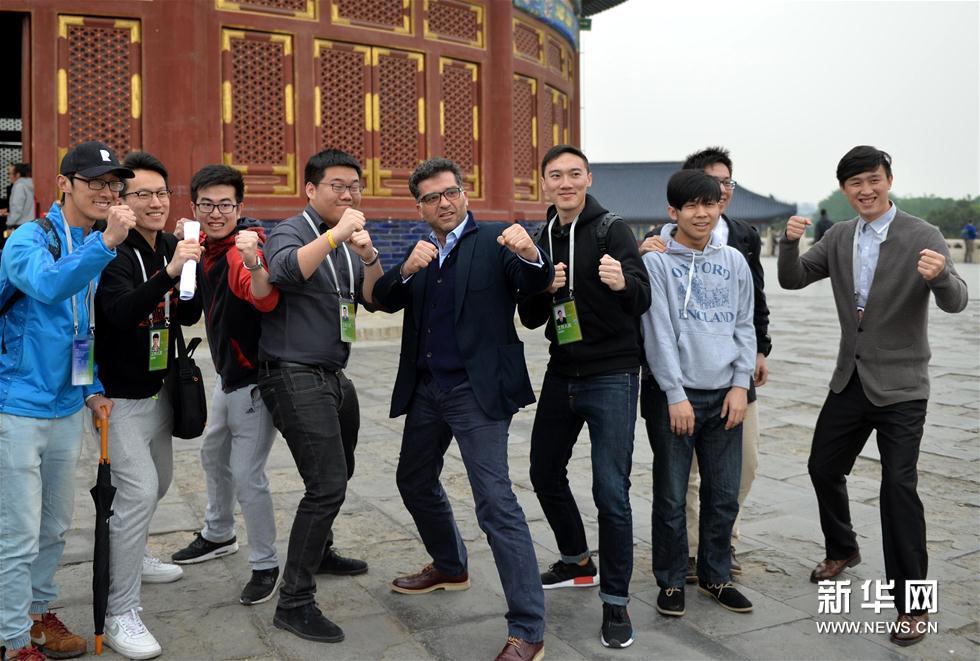 4月19日,评委团成员、德国导演弗洛里安·亨克尔·冯·多纳斯马在天坛公园圜丘台中心天心石上站立。新华社记者李鑫摄 当日,第六届北京国际电影节评委团成员参观天坛公园。