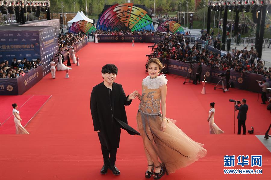 4月23日,歌手常石磊(左)、容祖儿亮相闭幕红毯。当日,第六届北京国际电影节在北京雁栖湖国际会展中心闭幕。 新华社发(李方宇摄)