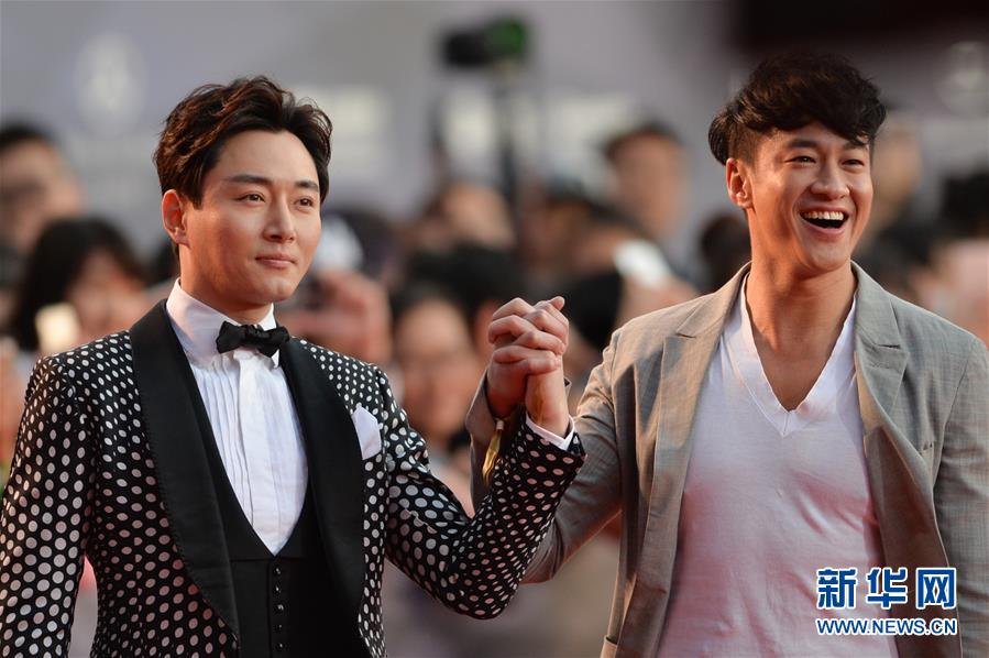 4月23日,演员李东学(左)、何润东亮相闭幕红毯。当日,第六届北京国际电影节在北京雁栖湖国际会展中心闭幕。 新华社记者陈斌摄