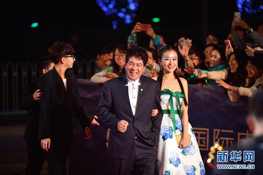 4月23日,朱时茂(中)亮相闭幕红毯。当日,第六届北京国际电影节在北京雁栖湖国际会展中心闭幕。 新华社记者周密摄