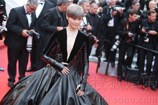 搜狐娱乐讯(图文:玄反影)2016年5月14日法国戛纳,第69届戛纳电影节,非竞赛展映影片《吹梦巨人》(The BFG)在坎城举行首映红毯。李宇春受品牌赞助邀约出席红毯仪式。她已银灰色发型,身着高定黑色长裙,搭配高级珠宝亮相红毯。
