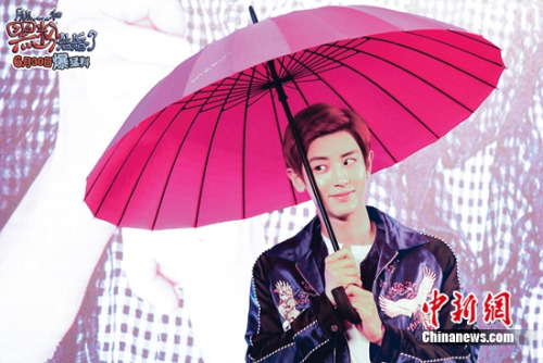 另外,由于早前印有朴灿烈和袁姗姗合约的杂志被粉丝抢购,今天两人还互换角色上演“真人版大片”,袁姗姗学朴灿烈一头粉发卖萌,朴灿烈则模仿袁姗姗歪头打伞。