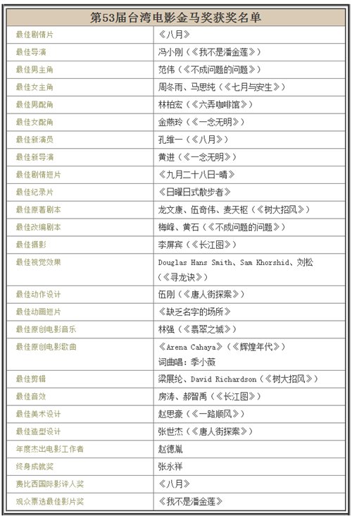 最后颁出的最佳剧情片大奖,由内地导演张大磊导演的处女作《八月》逆袭获奖。许鞍华评价:“张大磊拥有鬼魅的导演技巧。”还有一个爆冷的奖项是《六弄咖啡馆》林柏宏的最佳男配角奖,金马执委会的闻天祥透露,评审中陈建斌力挺林柏宏的表演长出了角色欠缺的部分,他的表演被低估了。