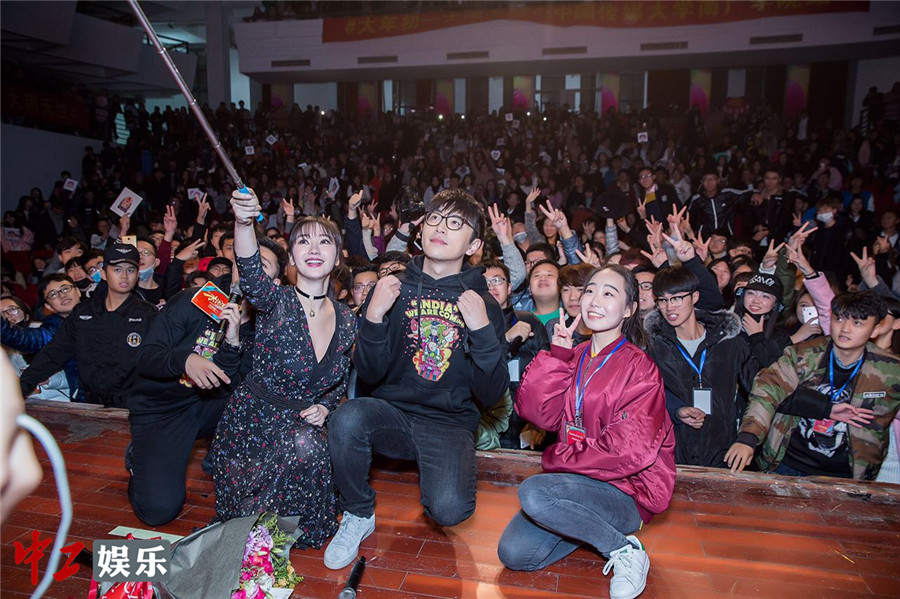 现场猜测影片最后柳岩到底和谁走到了一起时,学妹们齐呼“柳岩是小岳岳的,白客是师妹的”,被撩到的白客随即送给了全场一个飞吻,引起了一阵尖叫。