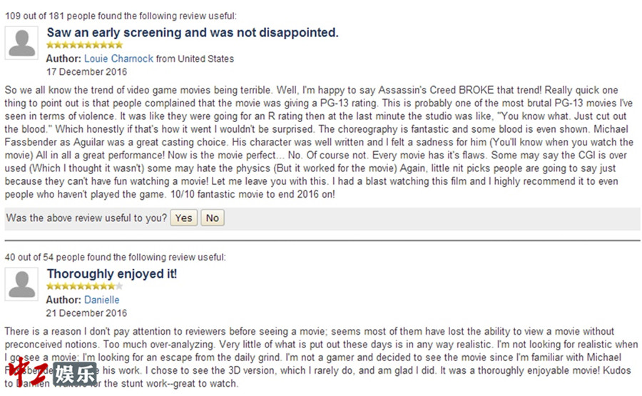 普通观众对电影《刺客信条》普遍打出了较高分数。烂番茄爆米花指数65%,IMDB评分6.7,CinemaScore也给出了B+的观众反馈。由此可见,电影《刺客信条》是一部合格的商业大片,对于一部游戏改编电影来说实属不易。许多观众都对电影大加赞赏,表达了对它的喜爱。“电影很棒!‘躬耕于黑暗,服务于光明’的刺客秩序非常有趣。虽然受到时间限制的影响,但仍然不失为一个好故事。”“《刺客信条》是一部好电影,别听影评人的大道理,放心去看吧!”“我不喜欢对电影过分分析,看电影不就是图个乐吗?《刺客信条》是一部娱乐性很强的电影!”而对于游戏玩家来说,电影更成为他们的一次狂欢,高度还原的场景和动作,让玩家们兴奋不已,将其奉为游戏改编电影的新高峰。“很明显打差评的人一定从来没有玩过《刺客信条》的游戏!作为多年的游戏玩家,我完全能够理解这部电影是多么伟大!信仰之跃、跑酷、打斗、袖剑等元素都完美还原,和玩游戏时的操作很接近!”“这部电影很棒,绝对值得一看,特别是对于《刺客信条》的粉丝来说。”影迷对演员的精彩演绎也夸赞连连:“法鲨是一个完美的选择!分饰两角的设定很赞,一冷一热的精彩表演帅到我了!”“玛丽昂不愧是奥斯卡影后,把想要治愈暴力和被迫服从圣殿骑士的矛盾感都拿捏到位了。”