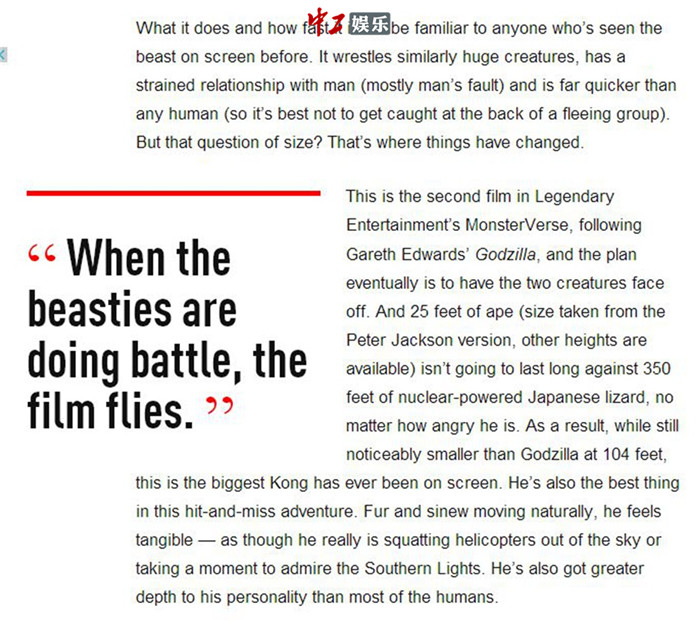 《金刚:骷髅岛》未映先火,对于一部主打燃爆群战的爆米花电影,在要求苛刻的媒体与评论界获得如此高的评价实数难得,可见影片的质量之高。片中无数巨型怪兽的群战场面,以及“抖森”等人踏进无人之境的刺激冒险剧情,都获得了国外媒体的一致称赞,也成为影片最引人期待的亮点。《福布斯》杂志大赞“视觉抢眼,角色主导的怪兽冒险,是的,这部电影太棒了。”《好莱坞报道者》则被影片的快节奏与精彩折服,认为“《金刚:骷髅岛》所有必备要素的比例得当,你会感觉在观影时时间飞逝,很少有这种类型的电影可以得到类似的评价。”《Variety》更是不吝赞美,表示“惊喜的地方在于,《金刚:骷髅岛》不仅比《侏罗纪世界》好十倍,而且它是一部令人兴奋、精心打造的原始野兽的电影奇观。”由此可见,《金刚:骷髅岛》将在3月24日为中国观众带来最嗨爽、最刺激的观影体验。