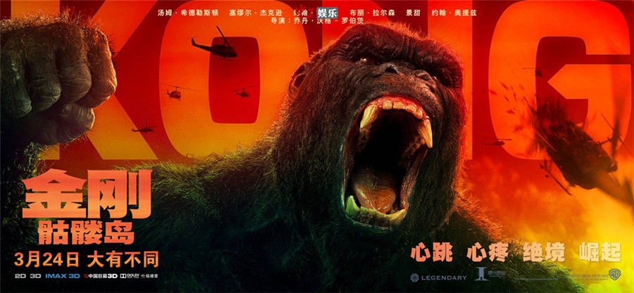 中工娱乐2017年3月15日报道 由华纳兄弟影业、传奇影业、腾讯影业出品的好莱坞动作冒险巨制《金刚:骷髅岛》近日曝光了“孤岛惊魂”版预告片,片中紧张的剧情、超燃劲爆的人、兽、怪激战场面让观众精神抖擞,纷纷表示要“坐等”影片上映。预告中的特效更让观众耳目一新,吸引无数大片自来水,期待值爆棚。该片将于3月24日以2D、3D、IMAX3D、中国巨幕3D、杜比全景声、杜比视界、临境音制式登陆中国院线。