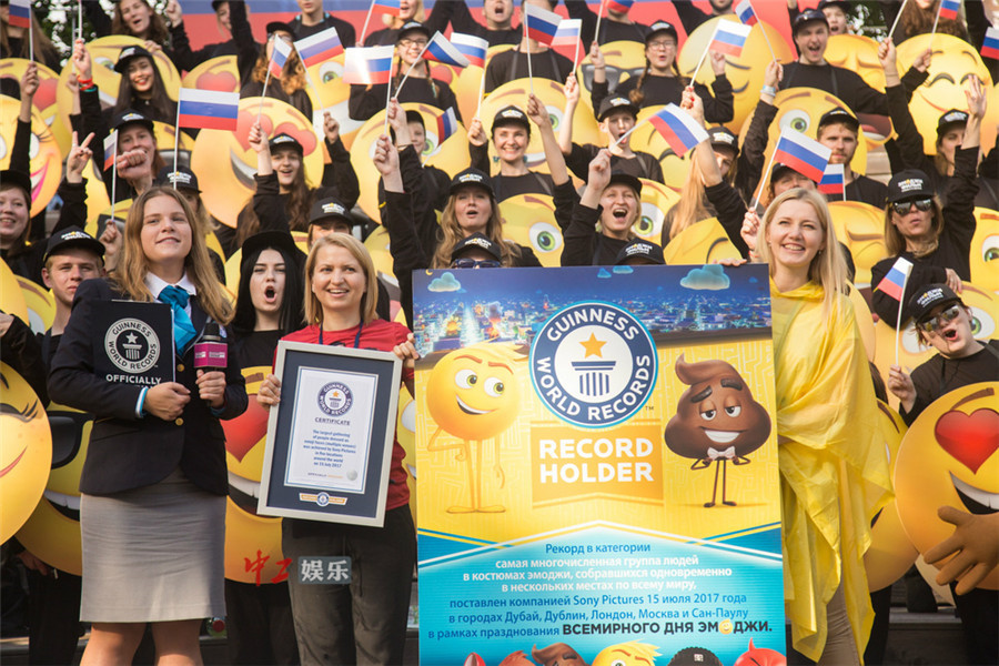 中工娱乐2017年7月17日报道 7月17日,一年一度的Emoji Day(世界表情日)再次欢乐来袭,今年恰逢由表情包主演的电影《表情奇幻冒险》即将上映,全球横跨三大洲、五大国的粉丝们为了欢庆这部动画佳作的到来,大玩变身秀,成功创造“世界各地最多人同时打扮成表情包”这项新的吉尼斯世界纪录,暑期档超高人气光环显露无疑。动画喜剧电影《表情奇幻冒险》由索尼动画制作出品,将于7月28日在北美上映,一场有关表情包的奇妙旅行即将嗨翻夏日大银幕,内地有望引进。