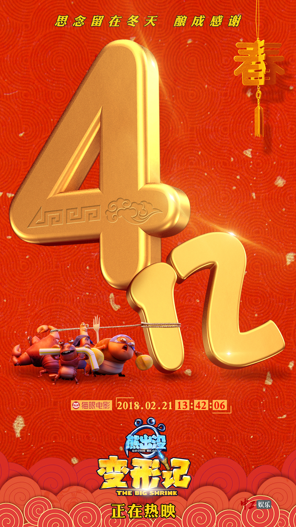 中工娱乐2018年2月22日报道 合家欢动画电影《熊出没·变形记》上映已有一周时间。截至2月21日13点,电影累积票房突破4亿!随着电影热映,口碑持续升温,上座率也连续7日位居春节档高位。